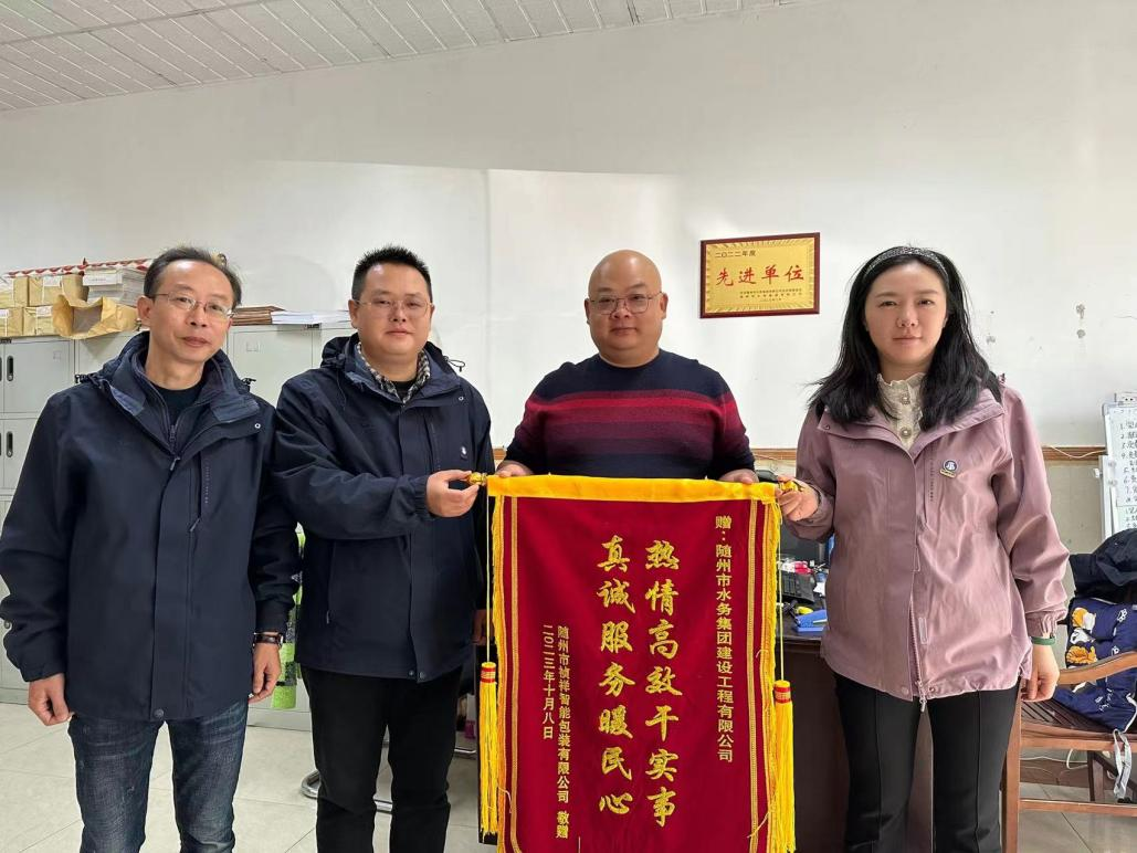 近日,隨州市禎祥智能包裝有限公司負責人親自將一面印有“熱情高效干實事,真誠服務暖民心”的錦旗送到水務集團,并對我們夸贊到“現在你們的速度太快了,我才打電話要申請通水,不到兩個小時,你們就來人把水給我接通了”。