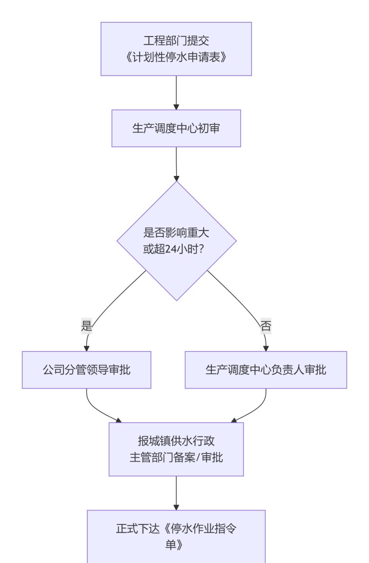 內(nèi)部審批:調(diào)度中心對停水的必要性、時長和范圍進(jìn)行初審。影響范圍廣或停水時間預(yù)計超過24小時的重大作業(yè),需報公司分管領(lǐng)導(dǎo)批準(zhǔn)。